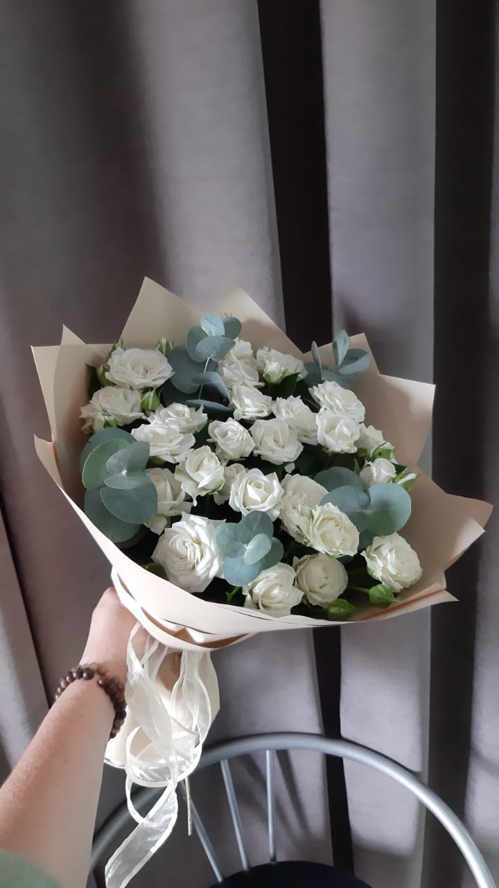 - Средний - кустовая роза - 7 шт., зелень, упаковка, лента