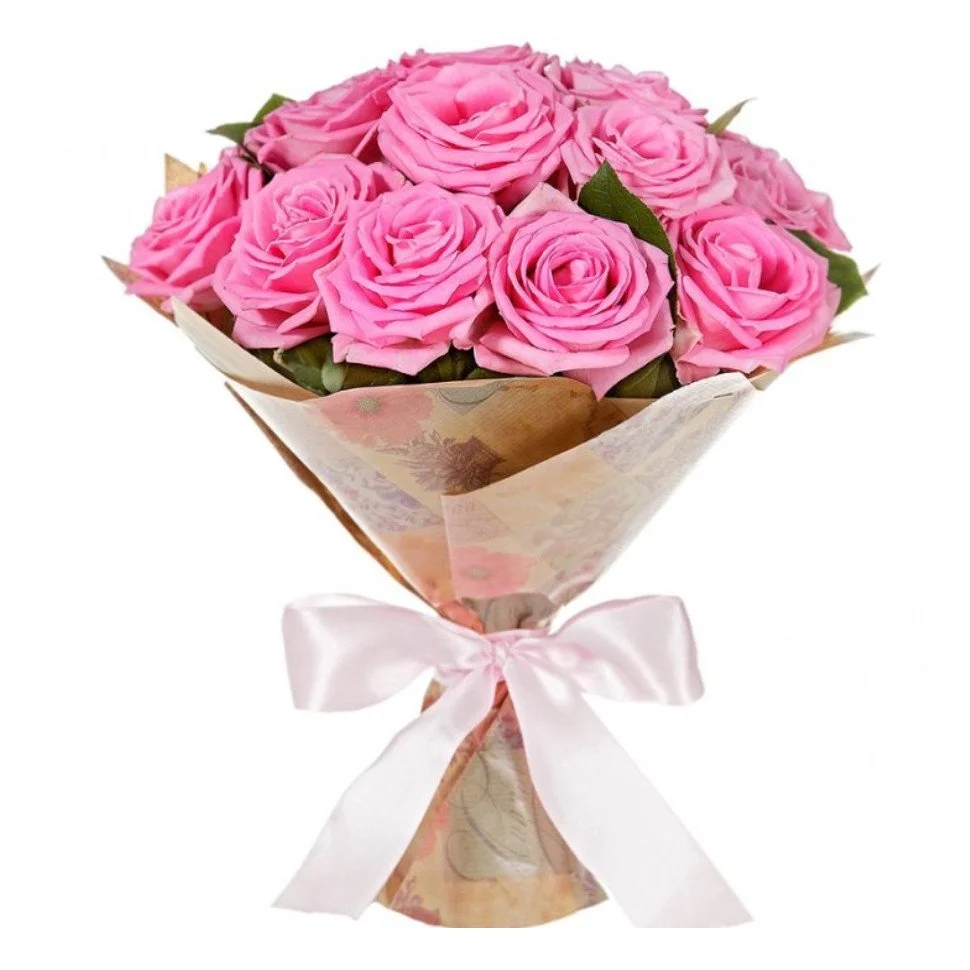Состав букета: розовые розы, упаковка, лента