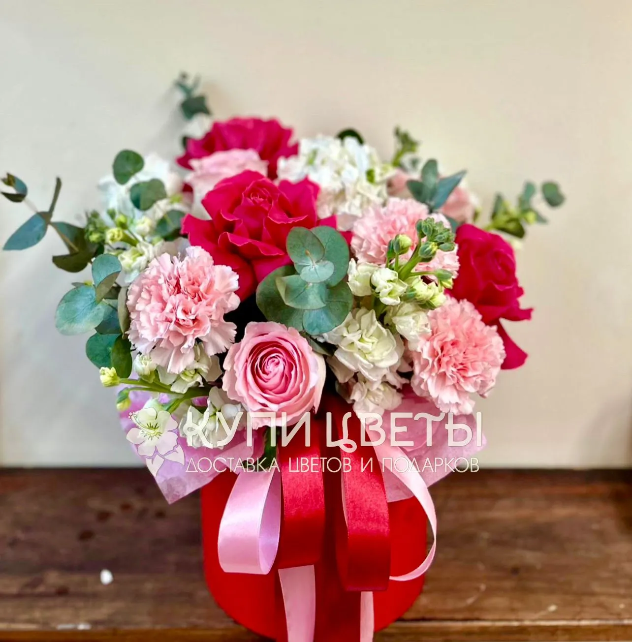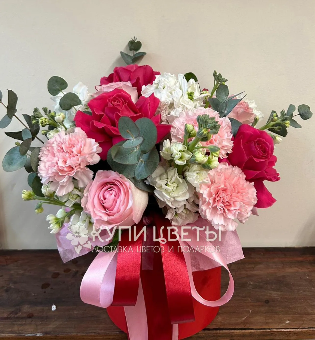 Французкая роза, роза, гвоздика, эвкалипт, шляпная коробка, лента |