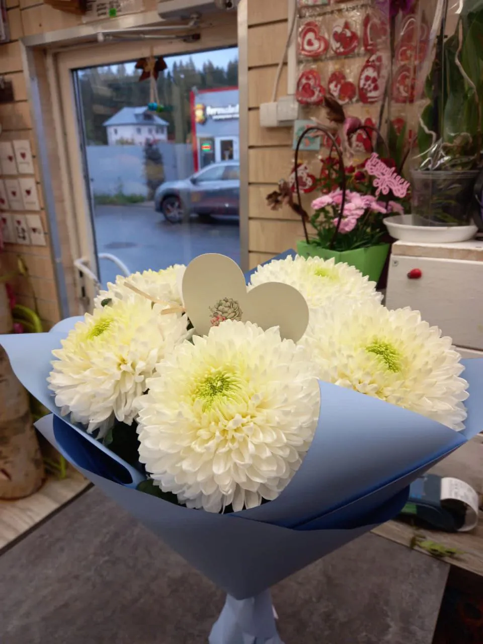 Белые одноголовые хризантемы, упаковка, лента |