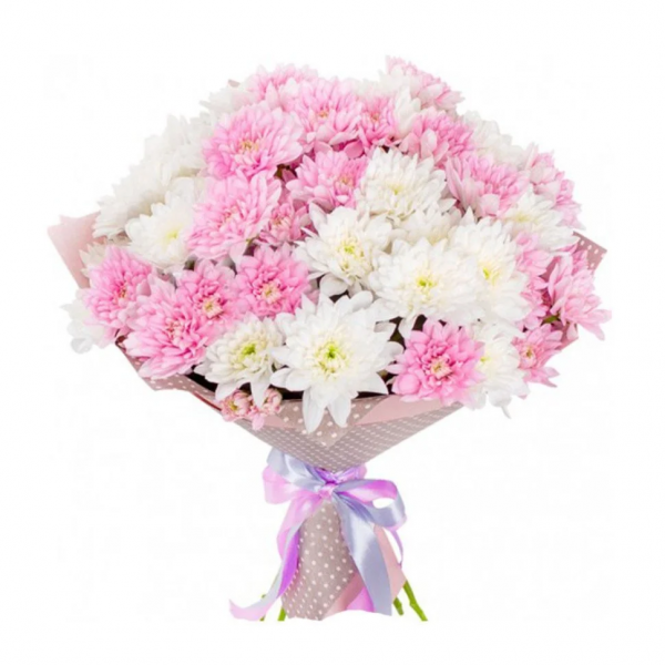Состав букета: Кустовые хризантемы,упаковка,лента
