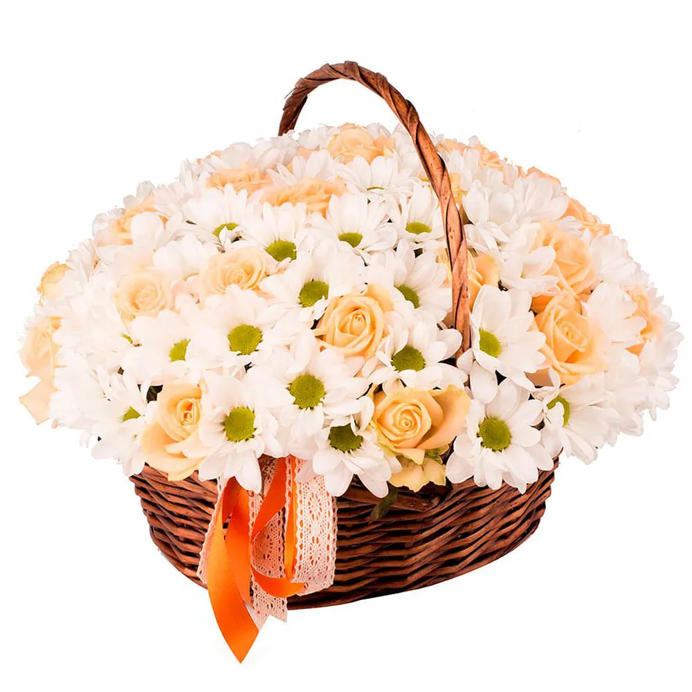 • Стандарт (хризантема кустовая - 5 шт., роза - 5 шт., оазис, корзина, лента)