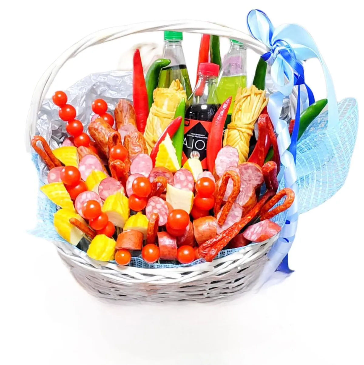 Состав: колбаса, хлеб, сыр, перец, черри, колбаски, корзина.