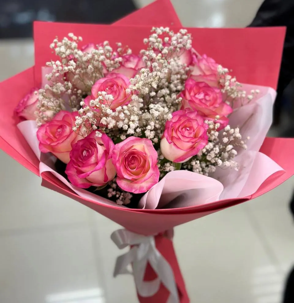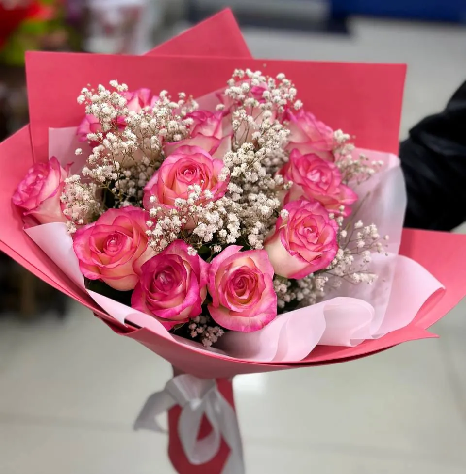 Свежий взгляд на классику: розовые розы и гипсофила в современной интерпретации. Этот букет – это стильный акцент для любого интерьера и прекрасный способ выразить свои чувства без лишних слов. Розовые розы– символ элегантности и грации, а гипсофила добавляет легкости и воздушности."