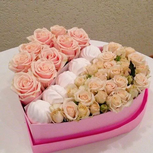 Шляпная коробка в виде сердца — это не просто подарок, а настоящее произведение искусства, которое способно украсить любой праздник. Внутри нее — воздушный зефир, тающий во рту, который наполняет атмосферу сладостью и нежностью. Дополняют композицию изысканные розы в нежных тонах: пастельные розовые, кремовые и белые бутоны, которые прекрасно сочетаются друг с другом.