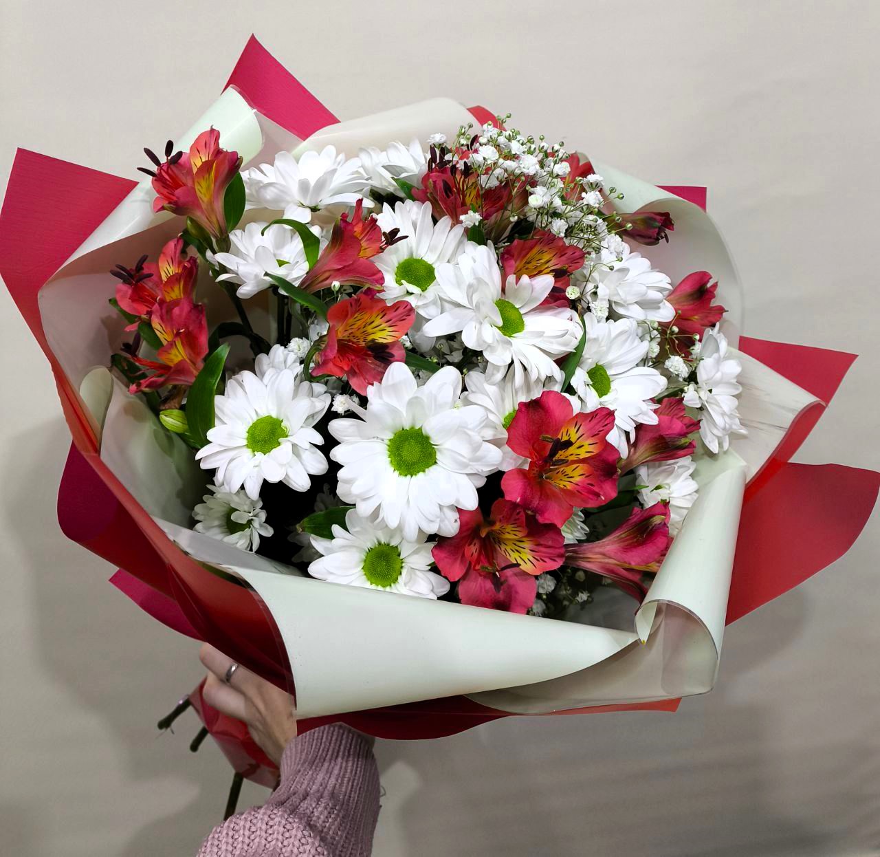 • Стандарт - хризантема кустовая - 4 шт., альстромерия - 3 шт., упаковка, лента