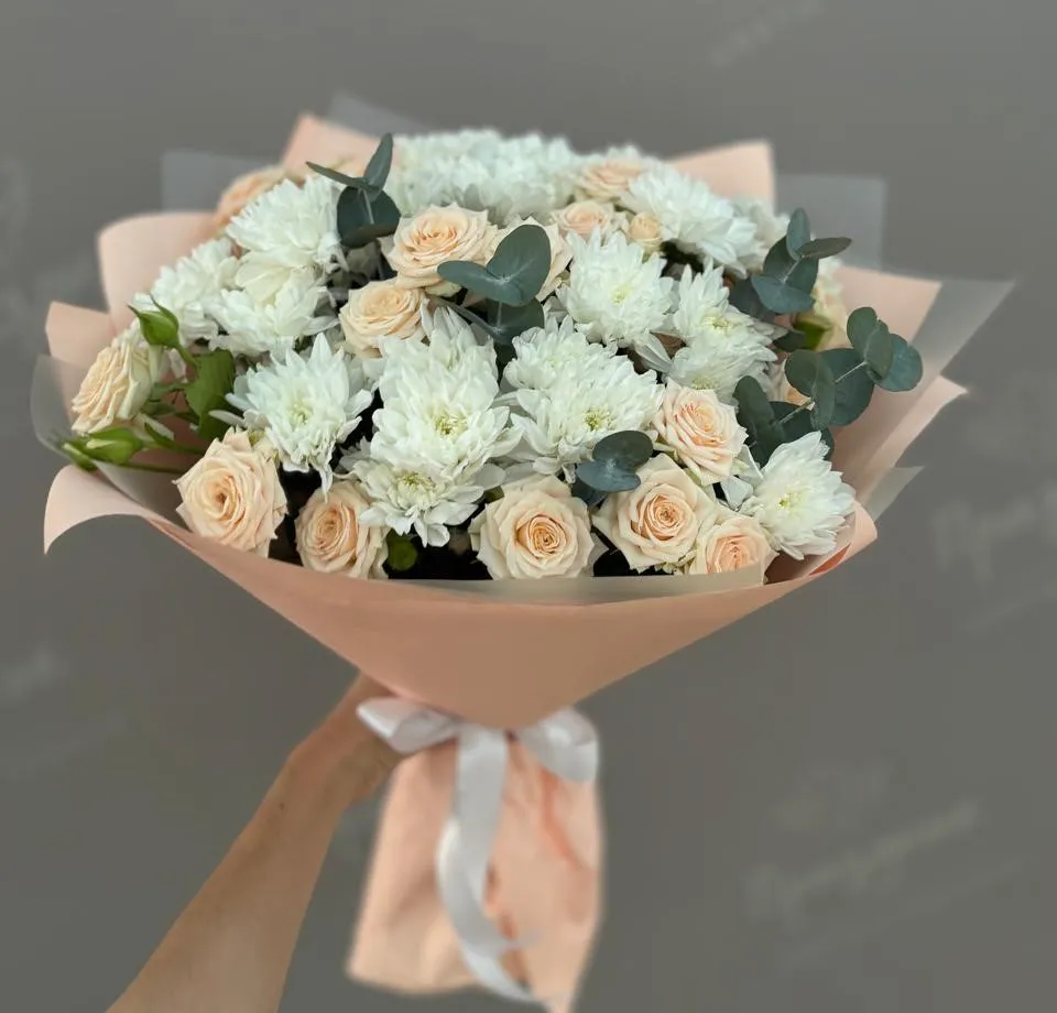 Букет из кустовых роз и хризантем — это прекрасное сочетание, которое приносит в любой интерьер или событие атмосферу радости и уюта. Кустовые розы славятся своей изящностью и нежностью, а хризантемы добавляют яркие акценты и разнообразие текстур. Такой букет станет отличным подарком на любой праздник или просто для поднятия настроения!