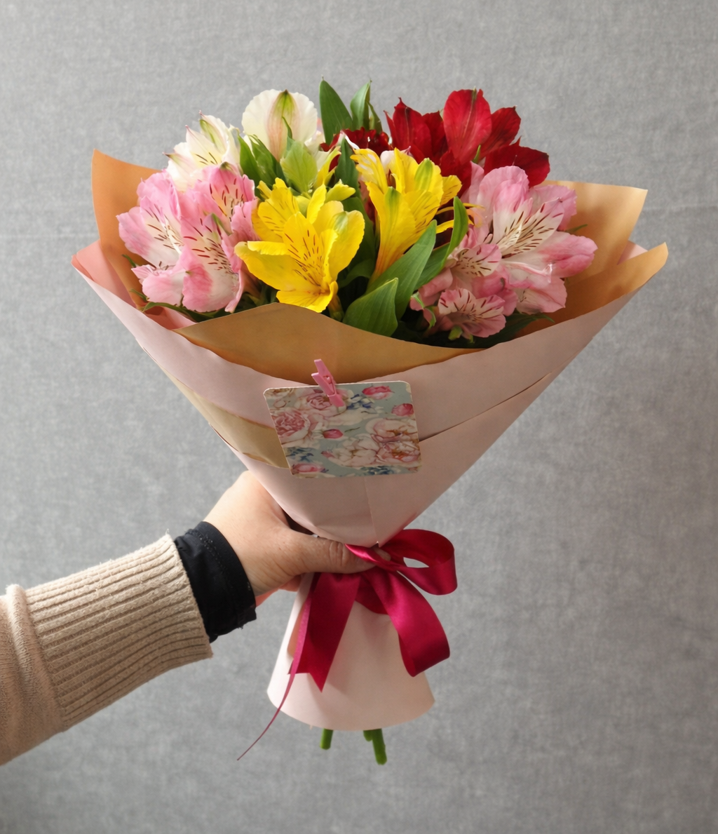 Этот яркий, сочный букет, состоящий из разноцветных альстромерий, передаст всю вашу теплоту и заботу !